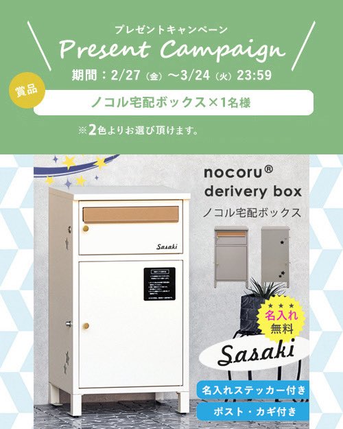 【X・Instagram懸賞】ノコル宅配ボックスを1名様にプレゼント 2026.03.22名入れができるノコルシリーズ‐プレゼントキャンペーン 賞品:ノコル宅配ボックス(1名様) 締切:2026年3月24日(火)公式Xアカウントをフォロー&キャンペーン対象ポストをリポストしてご応募ください。InstagramInstagramからも応募できます。※詳細はキャンペーンページにてご確認ください。応募はこちらから