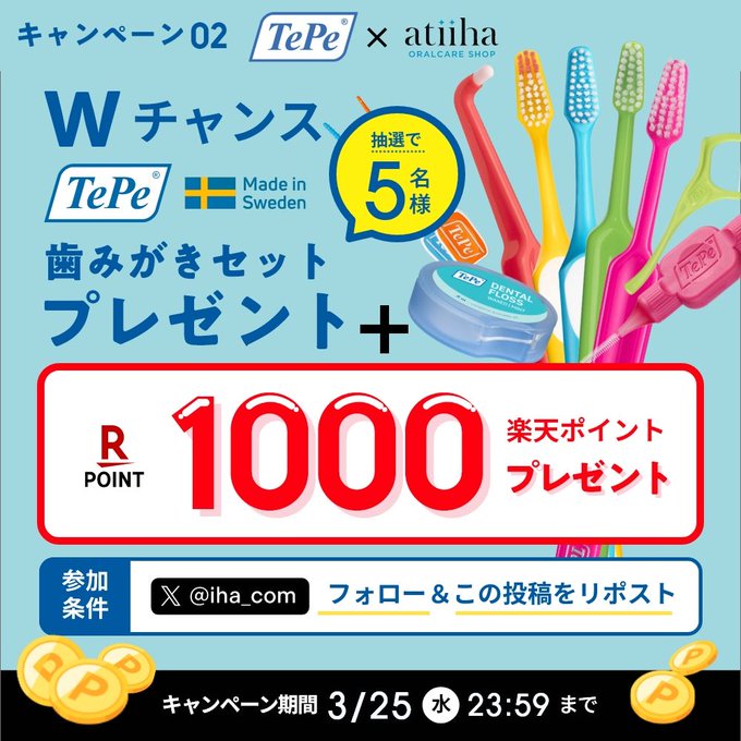 賞品:TePe歯みがきセット+楽天ポイント1,000pt(5名様)