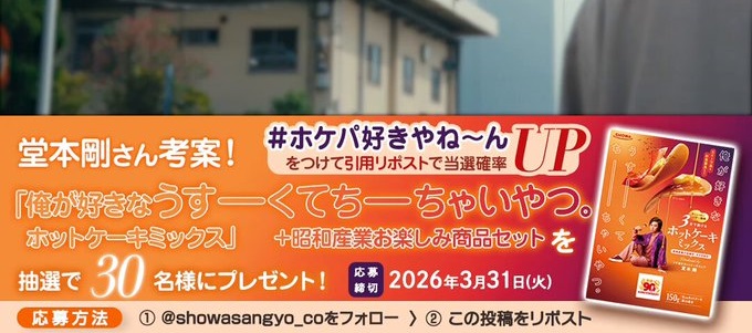 賞品:『俺が好きなうすーくてちーちゃいやつ。ホットケーキミックス』と他商品セット(30名様)