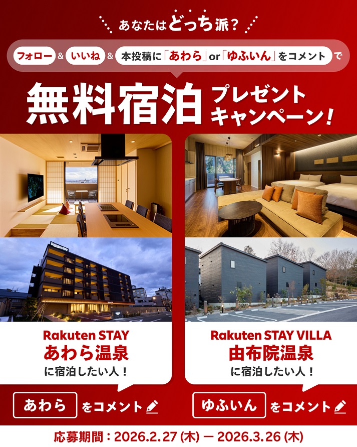 賞品:「Rakuten STAY あわら温泉」もしくは「Rakuten STAY VILLA 由布院温泉」の無料宿泊券(1組様)