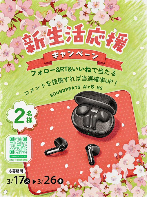 【X懸賞】インナーイヤーイヤホン SOUNDPEATS Air6 HSを2名様にプレゼント 2026.03.24SOUNDPEATS‐新生活応援キャンペーン 賞品:インナーイヤーイヤホン(2名様) 締切:2026年3月26日(木)〈応募方法〉 フォロー & RT & いいね※詳細はキャンペーンページにてご確認ください。応募はこちらから