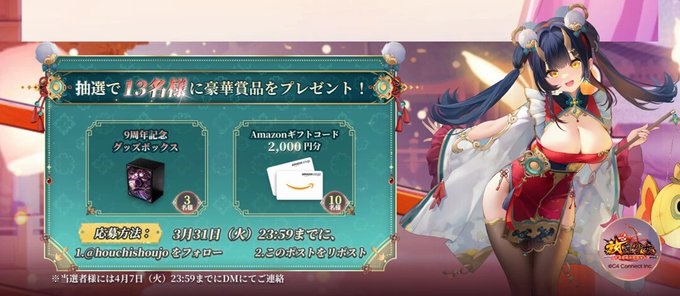 賞品:9周年記念グッズボックス、Amazonギフト券2,000円分(13名様)