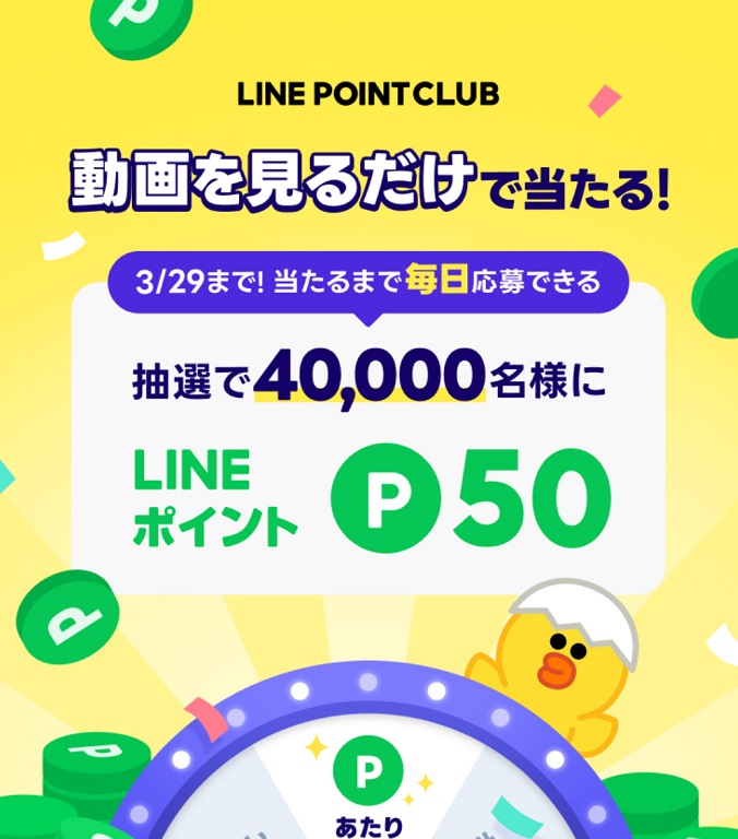 【毎日・LINE懸賞】LINEポイント50ポイントが4万名様にその場で当たる! 2026.03.25LINEで応募‐動画を見てLINEポイントを当てよう! 賞品:LINEポイント50ポイント(最大4万名様) 締切:2026年3月29日(日)動画を視聴すると抽選でLINEポイントが4万名様に当たる!※詳細はキャンペーンページにてご確認ください。応募はこちらから
