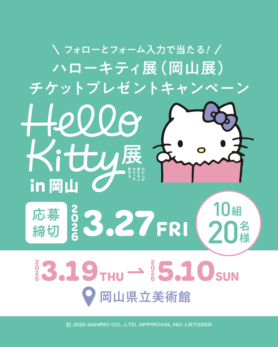 【Instagram懸賞】ハローキティ展(岡山展)のチケットとオリジナルノベルティを10組20名様にプレゼント
