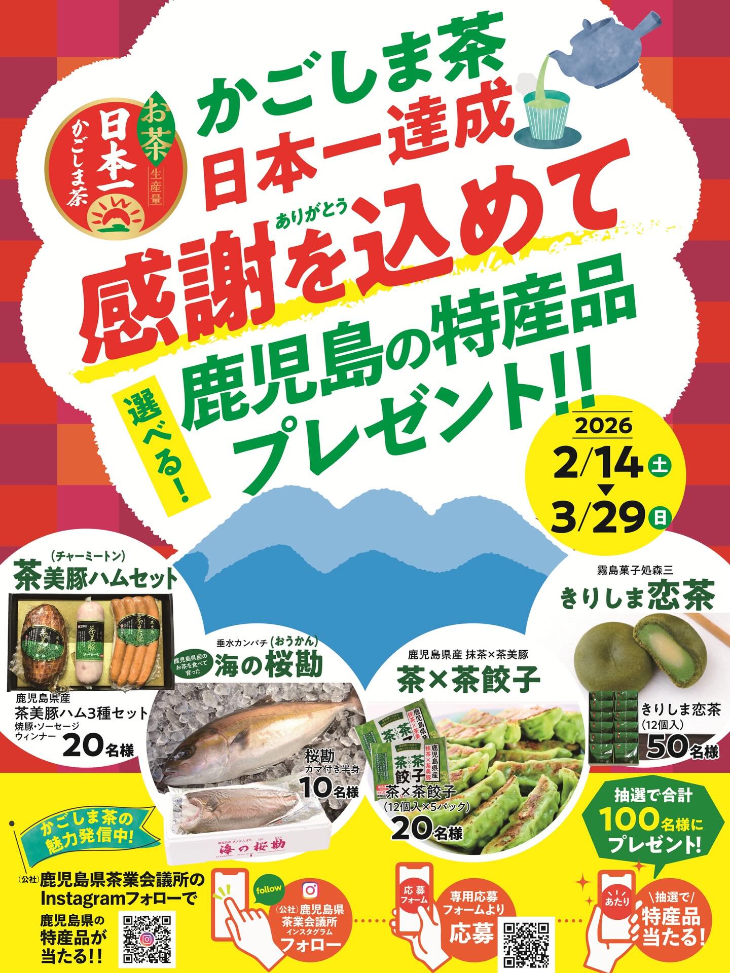 公式インスタグラム(@kagoshimacha)をフォローし、フォームより応募いただいた方の中から、抽選で鹿児島の特産品をプレゼント