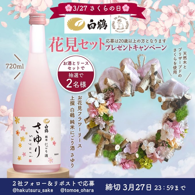 賞品:上撰 白鶴 純米にごり酒 さゆり 720ml&お花見フラワーリース(2名様)