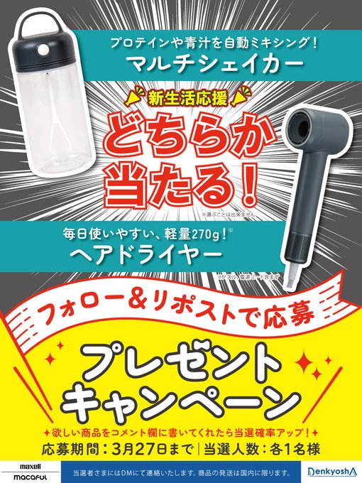 賞品:マルチシェイカー、ヘアドライヤー(2名様)