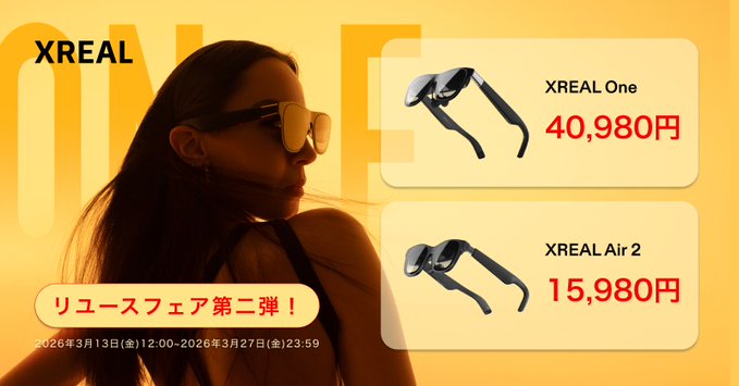 【X懸賞】XREAL Air 2を3名様にプレゼント 2026.03.25XREAL Japan‐2026 リユースフェア 第二弾 開催記念 賞品:XREAL Air 2(3名様) 締切:2026年3月27日(金)【応募方法】 ① @XREALJapan をフォロー ② 引用元ポストをリポスト※詳細はキャンペーンページにてご確認ください。応募はこちらから