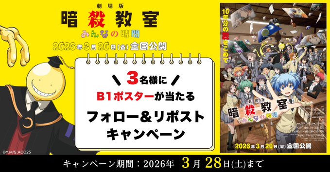 【X懸賞】『劇場版「暗殺教室」みんなの時間』B1ポスターを3名様にプレゼント 2026.03.25MOVIX・ピカデリー SMT劇場‐フォロー&リポストキャンペーン 賞品:B1ポスター(3名様) 締切:2026年3月28日(土)公式X(Twitter)アカウントをフォロー&キャンペーン対象ポストをリポストしてご応募ください。※詳細はキャンペーンページにてご確認ください。応募はこちらから