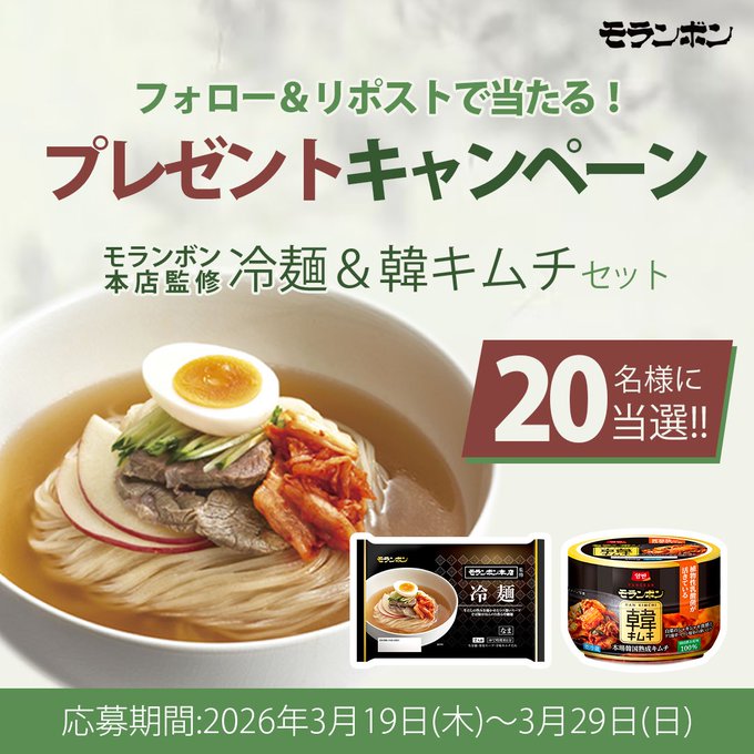 賞品:モランボン本店監修の「冷麺」とランキング番組でも高評価「韓キムチ」(20名様)