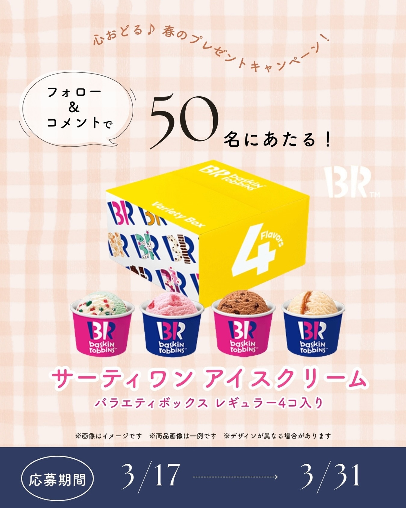 賞品:サーティワン アイスクリーム バラエティボックス レギュラー4コ入り eGift(50名様)