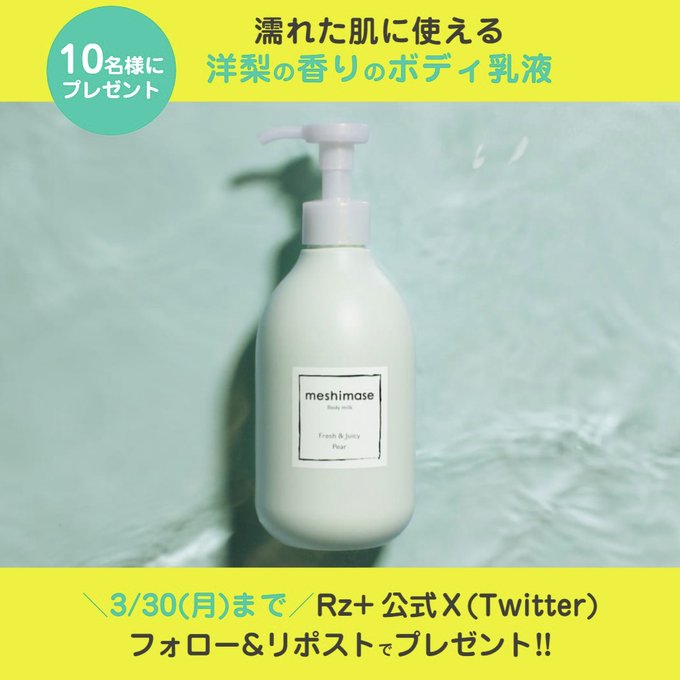 【X・Instagram懸賞】meshimase ボディミルク ペアーを20名様にプレゼント 2026.03.28Rz+ by ROSETTE‐プレゼントキャンペーン 賞品:meshimase ボディミルク ペアー(20名様) 締切:2026年3月30日(月)公式Xアカウントをフォロー&キャンペーン対象ポストをリポストしてご応募ください。Instagramからも応募できます。※詳細はキャンペーンページにてご確認ください。応募はこちらから