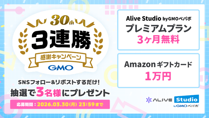 賞品:Amazonギフトカード 10,000円分 & Alive Studio プレミアムプラン 3ヶ月無料(3名様)