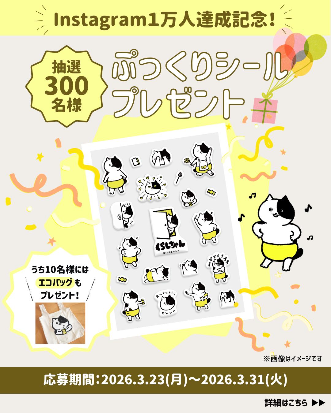 賞品:くらしちゃんオリジナル「ぷっくりシール」、エコバッグ(合計300名様)