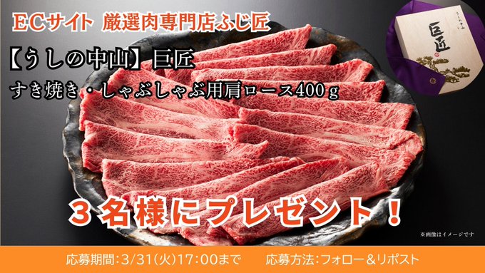 賞品:うしの中山「巨匠」すき焼き・しゃぶしゃぶ用肩ロース400g(3名様)
