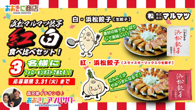 【X懸賞】餃子セットを3名様にプレゼント 2026.03.30おおきに商店‐フォロー&リポストキャンペーン 賞品:餃子セット(3名様) 締切:2026年3月31日(火)公式X(Twitter)アカウントをフォロー&キャンペーン対象ポストをリポストしてご応募ください。※詳細はキャンペーンページにてご確認ください。応募はこちらから