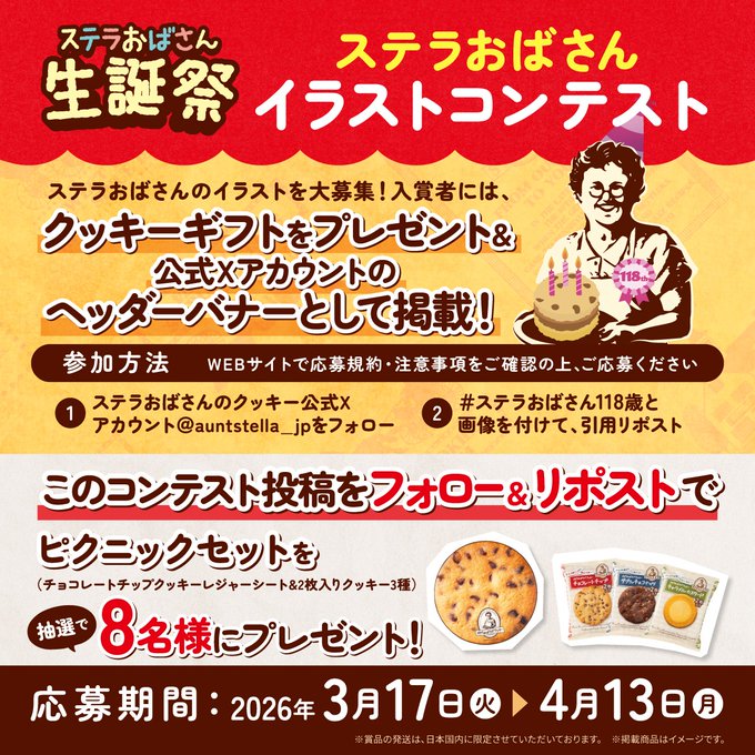 【X懸賞】ピクニックセットを8名様にプレゼント 2026.03.31 2026.03.30ステラおばさんのクッキー‐フォロー&リポストキャンペーン 賞品:ピクニックセット(8名様) 締切:2026年4月13日(月)公式X(Twitter)アカウントをフォロー&キャンペーン対象ポストをリポストしてご応募ください。※詳細はキャンペーンページにてご確認ください。応募はこちらから