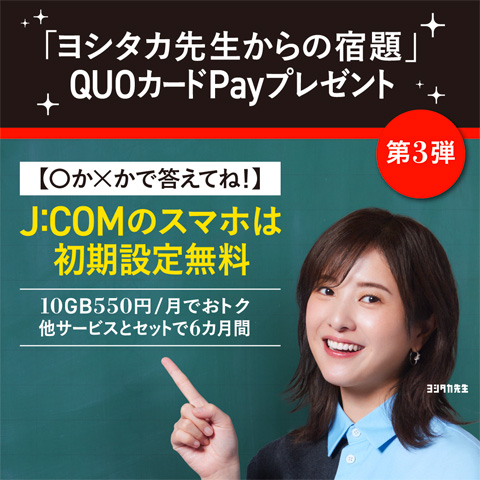 QUOカードPay500円分を100名様にプレゼント 2026.03.31Fun! J:COM‐ヨシタカ先生からの宿題 賞品:QUOカードPay500円分(100名様) 締切:2026年4月23日(木)「ヨシタカ先生からの宿題」に答えてQUOカードPayプレゼント※詳細はキャンペーンページにてご確認ください。応募はこちらから