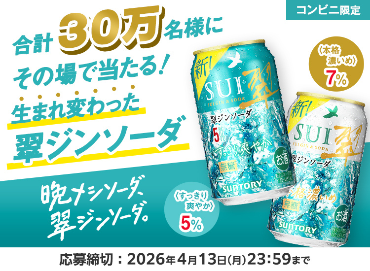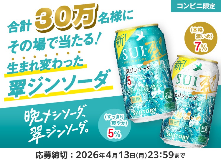 賞品:翠ジンソーダ〈すっきり爽やか〉5% 350ml缶/翠ジンソーダ〈本格濃いめ〉7% 350ml缶 どちらか1本 コンビニ無料引換クーポン(合計30万名様)