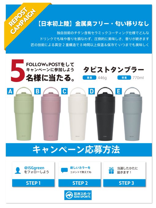 【X懸賞】WOKY タピストボトルを5名様にプレゼント 2026.03.31石井スポーツ公式(登山・アウトドア)‐プレゼントキャンペーン 賞品:WOKY タピストボトル(5名様) 締切:2026年4月2日(木)①@ISGgreenをフォロー ②ほしいカラーを教えてね※詳細はキャンペーンページにてご確認ください。応募はこちらから
