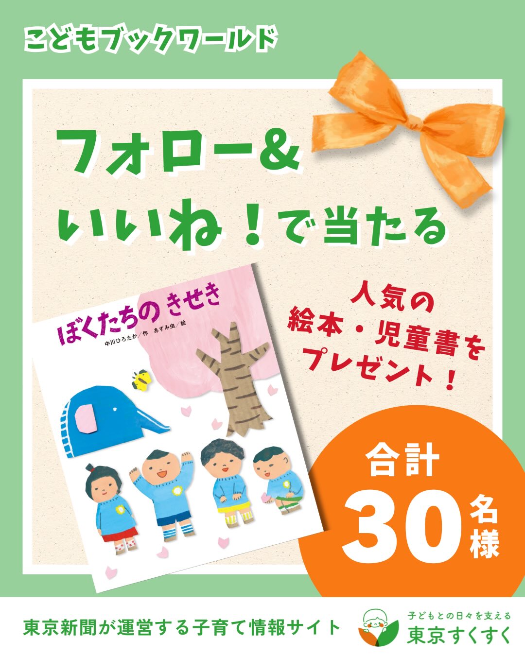 【Instagram懸賞】人気の絵本・児童図書を30名様にプレゼント 2026.04.01東京すくすく‐フォロー&いいねキャンペーン 賞品:絵本、児童図書(30名様) 締切:2026年4月3日(金)応募方法: 1. 公式Instagramアカウントをフォロー 2. 対象の投稿に「いいね!」※詳細はキャンペーンページにてご確認ください。応募はこちらから