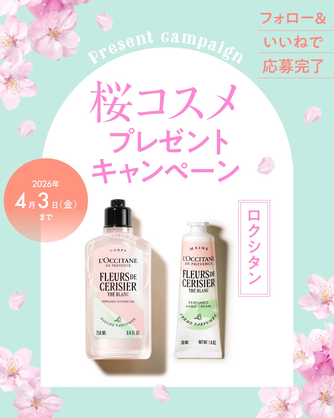 賞品:ロクシタン テ・ブラン サクラ パフュームド シャワージェル&テ・ブラン サクラ パフュームド ハンドクリーム(3名様)
