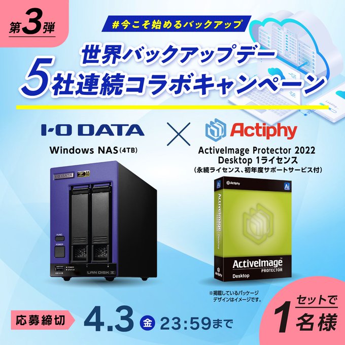 賞品:2ドライブNAS 4TB LAN DISK(HDL2-Z22SI3Aシリーズ)&ActiveImage Protector 2022 Desktop 1ライセンス(永続ライセンス、初年度サポートサービス付)(1名様)