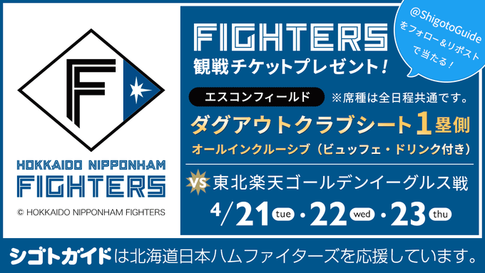 【X懸賞】ファイターズvsイーグルス戦チケット エスコンフィールド ダグアウトクラブシート 2枚1組を3名様にプレゼント