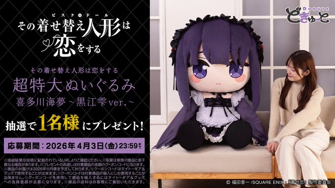 賞品:どきゅーと その着せ替え人形は恋をする 超特大ぬいぐるみ 喜多川海夢~黒江雫ver.~(1名様)