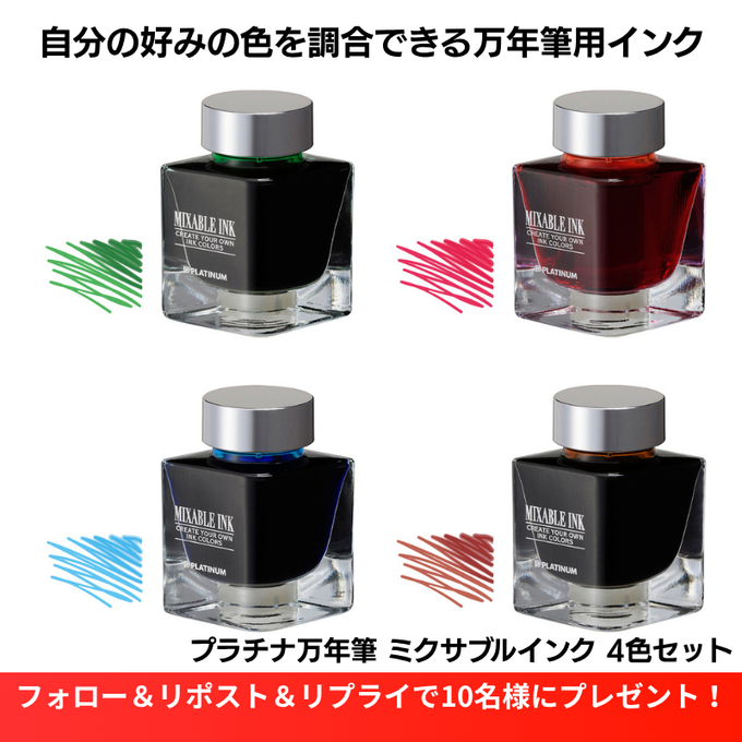 【X懸賞】プラチナ万年筆ミクサブルインク 20ml 4色セットを10名様にプレゼント 2026.04.02ヨドバシ@文房具専門‐プレゼントキャンペーン 賞品:プラチナ万年筆ミクサブルインク 20ml 4色セット(10名様) 締切:2026年4月4日(土)👉フォロー&リポスト👉持っている万年筆の本数を✍️※詳細はキャンペーンページにてご確認ください。応募はこちらから