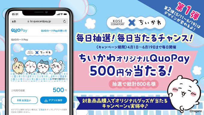 コーセーコスメポート‐ちいかわオリジナルQuoPay500円分当たる!キャンペーン