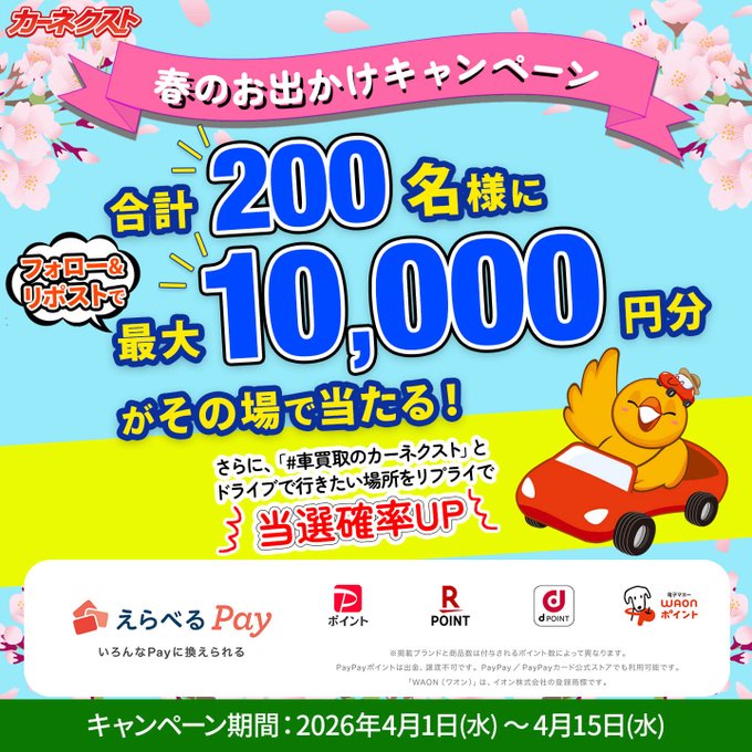 【毎日・X懸賞】えらべるPay最大1万円分が200名様にその場で当たる! 2026.04.02カーネクスト‐春のお出かけキャンペーン 賞品:最大1万円分のえらべるPay(200名様) 締切:2026年4月15日(水)カーネクスト公式Xアカウントをフォロー&キャンペーン対象ポストをリポストしてご応募ください。※詳細はキャンペーンページにてご確認ください。応募はこちらから