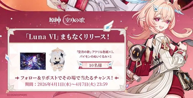 【毎日・X懸賞】原神グッズが10名様にその場で当たる! 2026.04.02原神‐「Luna Ⅵ」リリース直前キャンペーン 賞品:原神グッズ(10名様) 締切:2026年4月7日(火)原神公式Xアカウントをフォロー&キャンペーン対象ポストをリポストして、キャンペーンページからご応募ください。※詳細はキャンペーンページにてご確認ください。応募はこちらから