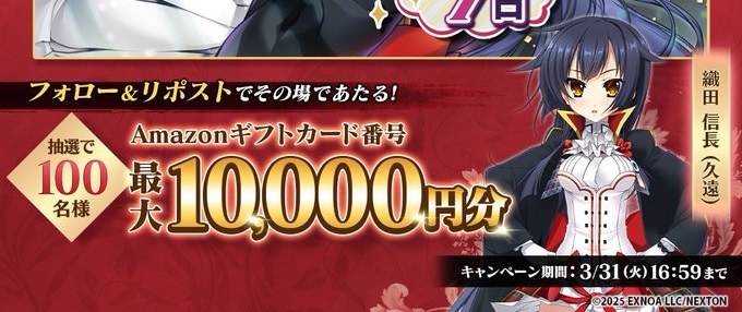 恋姫大戦公式Xアカウントをフォロー&キャンペーン対象ポストをリポストしてご応募ください。
