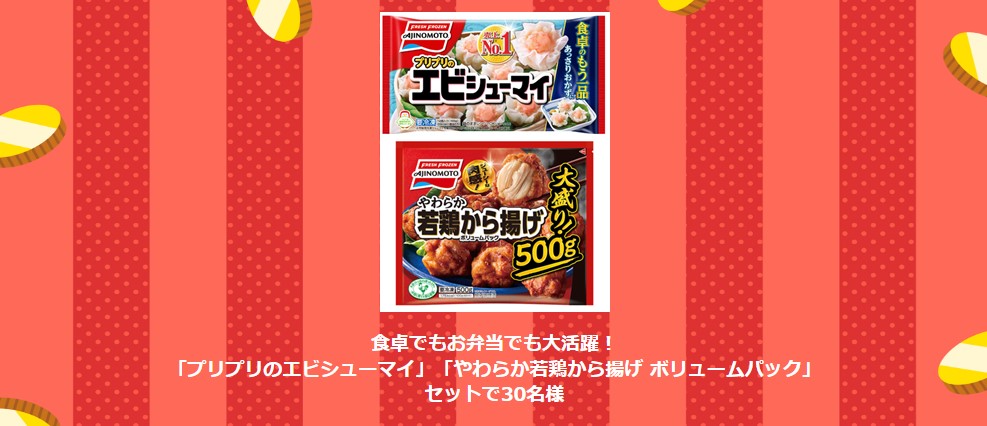 賞品:「プリプリのエビシューマイ」「やわらか若鶏から揚げ ボリュームパック」(30名様)