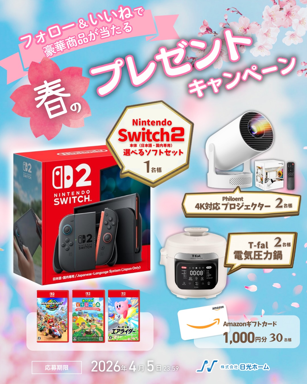 【Instagram懸賞】Nintendo Switch 2、Philoent 4K対応プロジェクター、T-fal 電気圧力鍋などを合計35名様にプレゼント