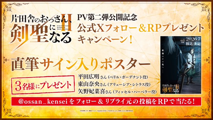 【X懸賞】サイン入りティザービジュアルポスターを3名様にプレゼント 2026.04.02「片田舎のおっさん、剣聖になる」アニメ‐プレゼントキャンペーン 賞品:サイン入りティザービジュアルポスター(3名様) 締切:2026年4月5日(日)①@ossan_kensei フォロー ②引用元投稿RPで応募※詳細はキャンペーンページにてご確認ください。応募はこちらから