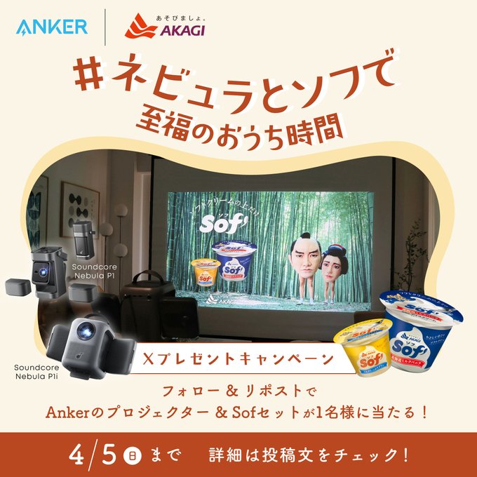 賞品:AnkerのプロジェクターとSofセット(1名様)