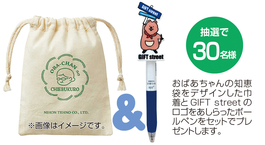 正解者の中から抽選で30名の方に日本テクノ特製「おばあちゃんの知恵袋巾着」と「GIFT streetボールペン」をセットでプレゼント!