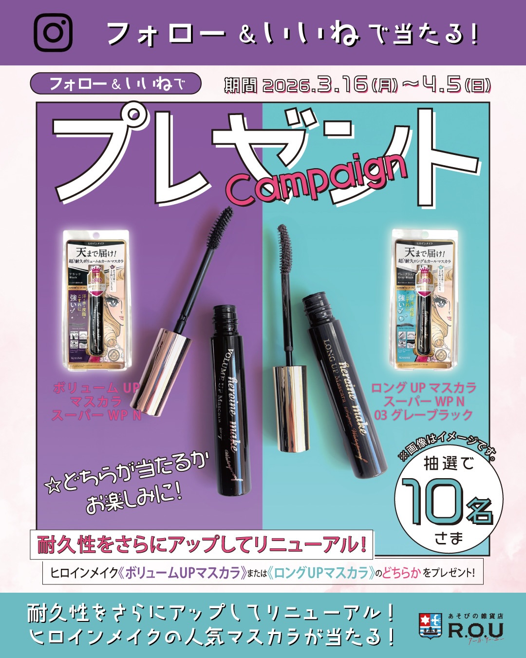 賞品:ヒロインメイク「ロングUPマスカラ スーパーWP N 03グレーブラック」または「ボリュームUPマスカラ スーパーWP N」のどちらか(10名様)