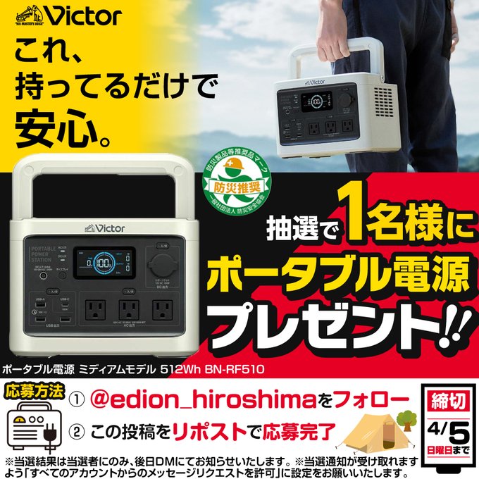 賞品:ビクター ポータブル電源 BN-RF510(1名様)