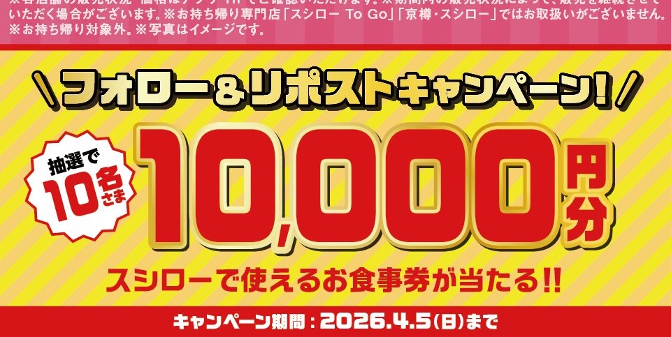 賞品:スシローで使えるお食事券10,000円分(10名様)