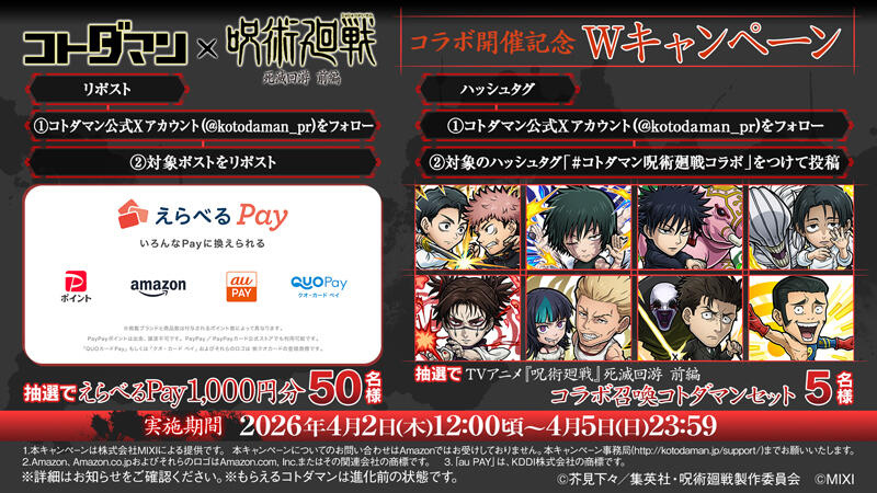 賞品:えらべるPay1,000円分、コラボ召喚コトダマンセット(合計55名様)