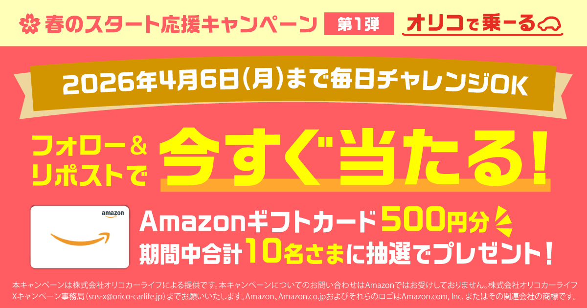 オリコで乗ーる(カーリース / クルマのサブスク)公式Xアカウントをフォロー&キャンペーン対象ポストをリポストして、記載されているURLからご応募ください。