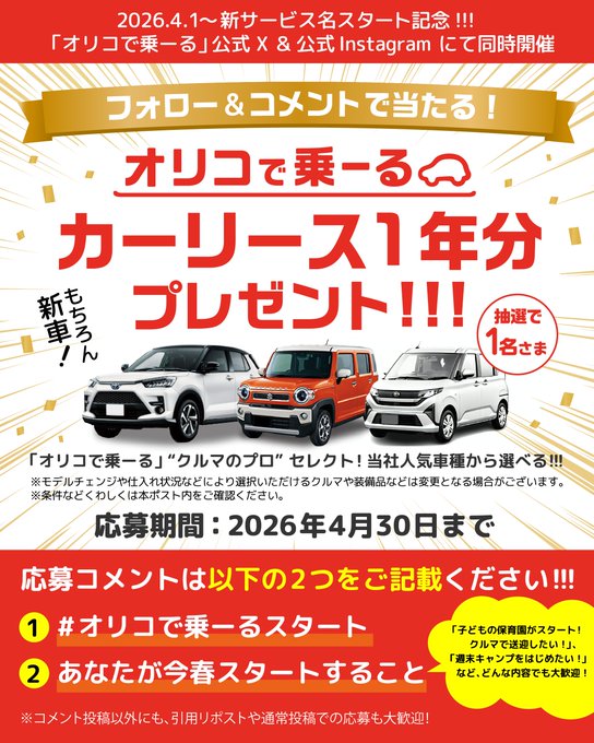【X・Instagram懸賞】「オリコで乗ーる」カーリース1年分を1名様にプレゼント 2026.04.04オリコで乗ーる‐プレゼントキャンペーン 賞品:「オリコで乗ーる」カーリース1年分(1名様) 締切:2026年4月30日(木)フォロー&コメントで当たる!※詳細はキャンペーンページにてご確認ください。応募はこちらから