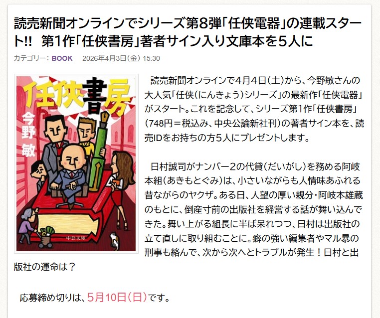 賞品:第1作「任侠書房」著者サイン入り文庫本(5名様)
