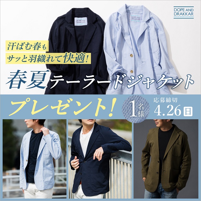 DOPE&DRAKKAR サマーテーラード ジャケットを1名様にプレゼント 2026.04.04 2026.04.03藤巻百貨店‐プレゼントキャンペーン 賞品:DOPE&DRAKKAR サマーテーラード ジャケット(1名様) 締切:2026年4月26日(日)応募フォームより必要事項を入力してご応募ください。※詳細はキャンペーンページにてご確認ください。応募はこちらから