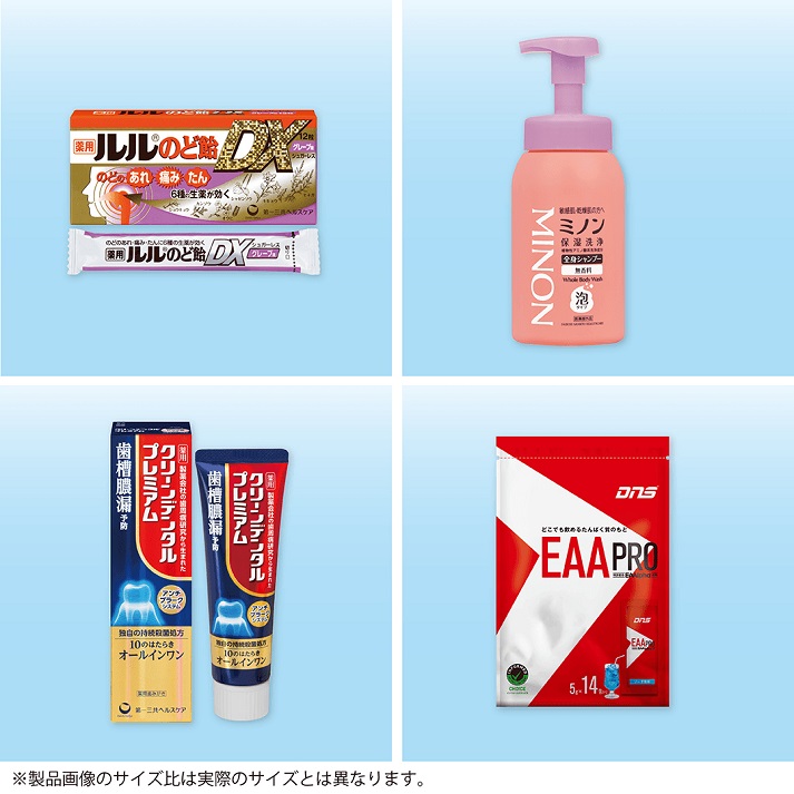 賞品:ルルのど飴DXグレープ味、ミノン全身シャンプー泡タイプ、クリーンデンタルプレミアム、DNS EAA PRO ソーダ風味(合計20名様)