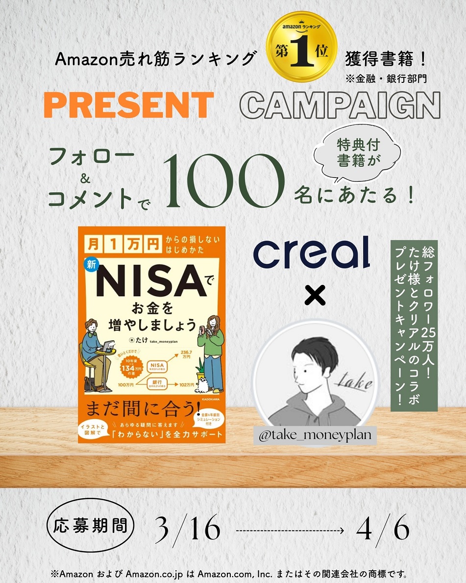 賞品:たけさん著『月1万円からの損しないはじめかた 新NISAでお金を増やしましょう』(100名様)