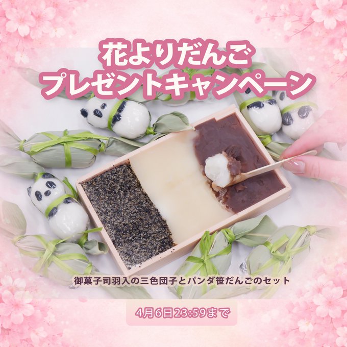 賞品:羽入の名物三色だんご(1箱)、ぱんだ笹団子(2個)のセット(3名様)